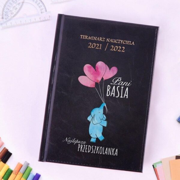 Kalendarz książkowy, czarny, w formacie A5 z indywidualnym nadrukiem dla przedszkolanki.